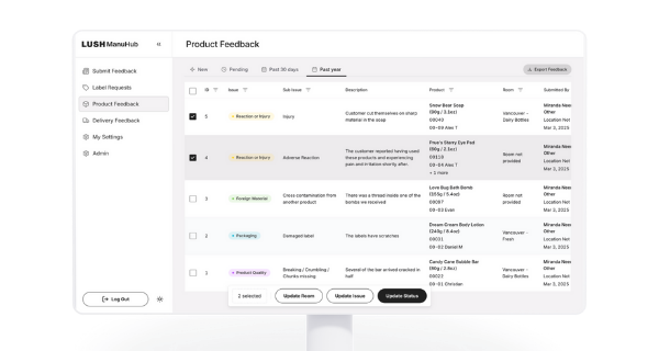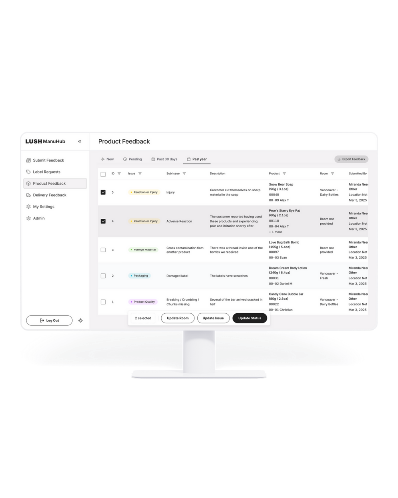 I was contracted to build an internal hub for Lush to scale key communications and feedback between retail outlets and their manufacturing teams. I worked closely with key stakeholders to understand their needs, current workflows, and key priorities. I owned the end-to-end solution conception and execution, from the UI/UX to database design.